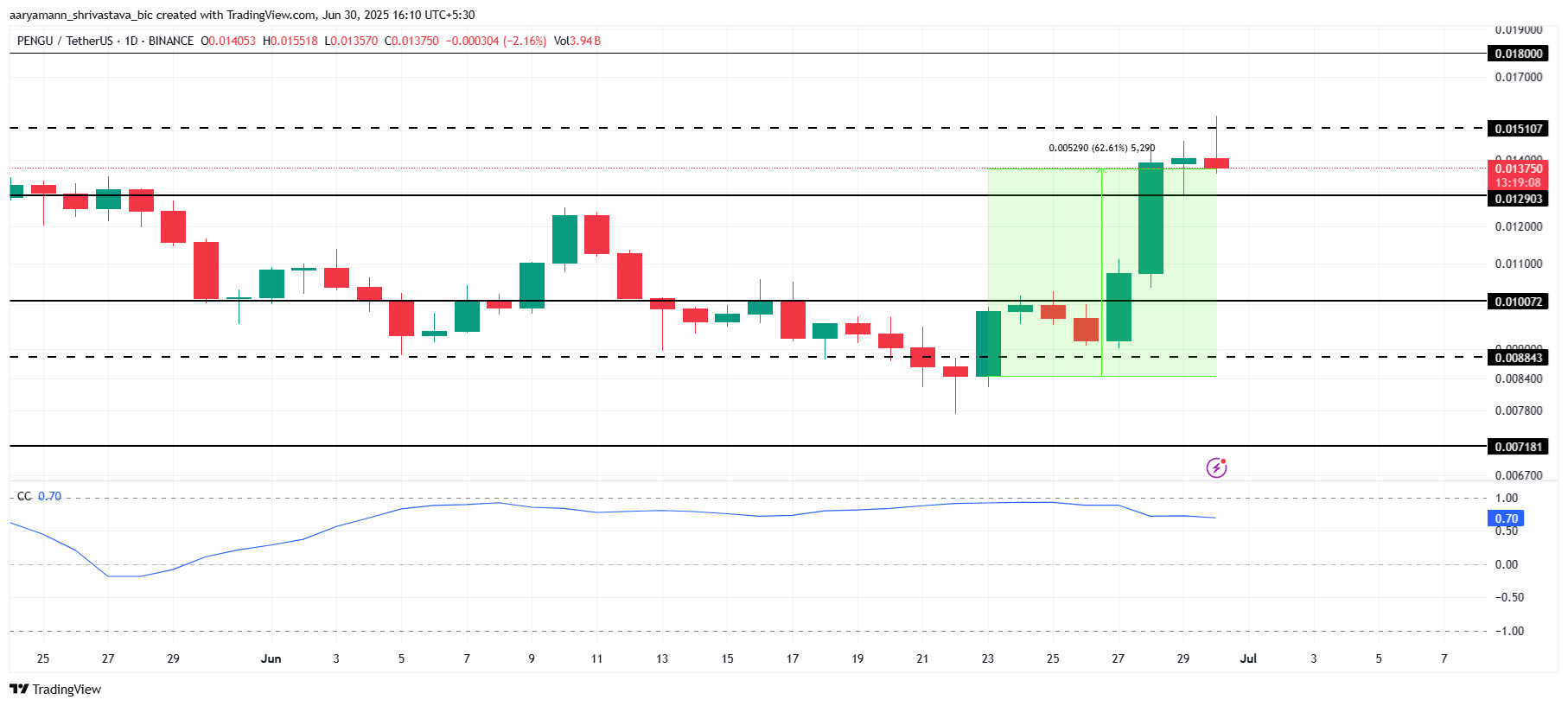 PENGU had a rocky start to June but has gained significant traction over the past week. The meme coin rose by 62.6%, reaching $0.0137, marking a two-month high. This recent surge shows the altcoin’s ability to rebound despite earlier struggles, drawing attention from investors.