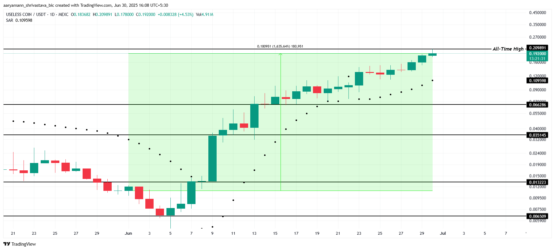 USELESS led the meme coin market in June with an explosive 1,635% rise, setting new all-time highs nearly every day. The altcoin reached its latest ATH today at $0.209. This growth showcases impressive momentum, and investors are watching closely for further upward movement.