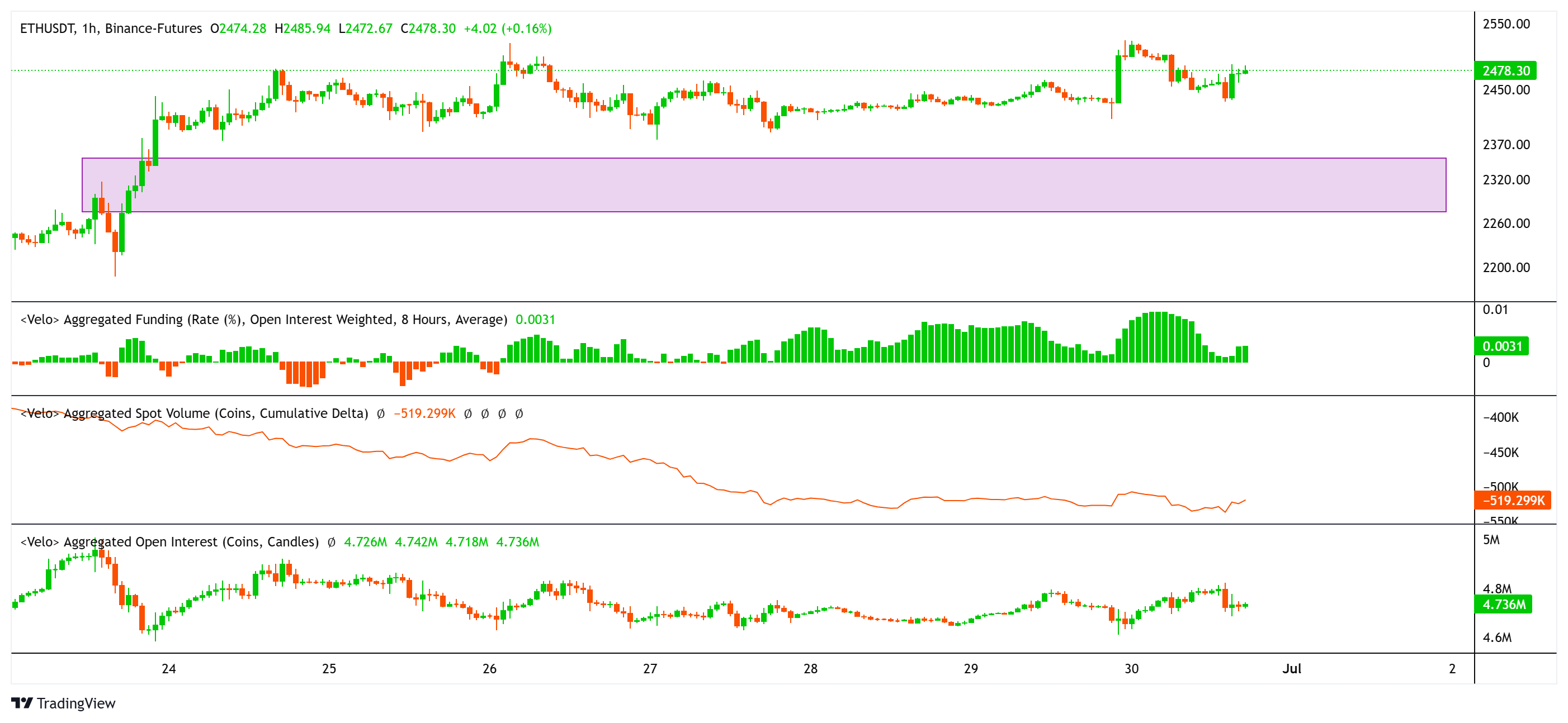 The sudden liquidity sweep drove ETH to its multi-month support, but buyers swiftly absorbed the decline, pushing the price above $2,500 by Monday.