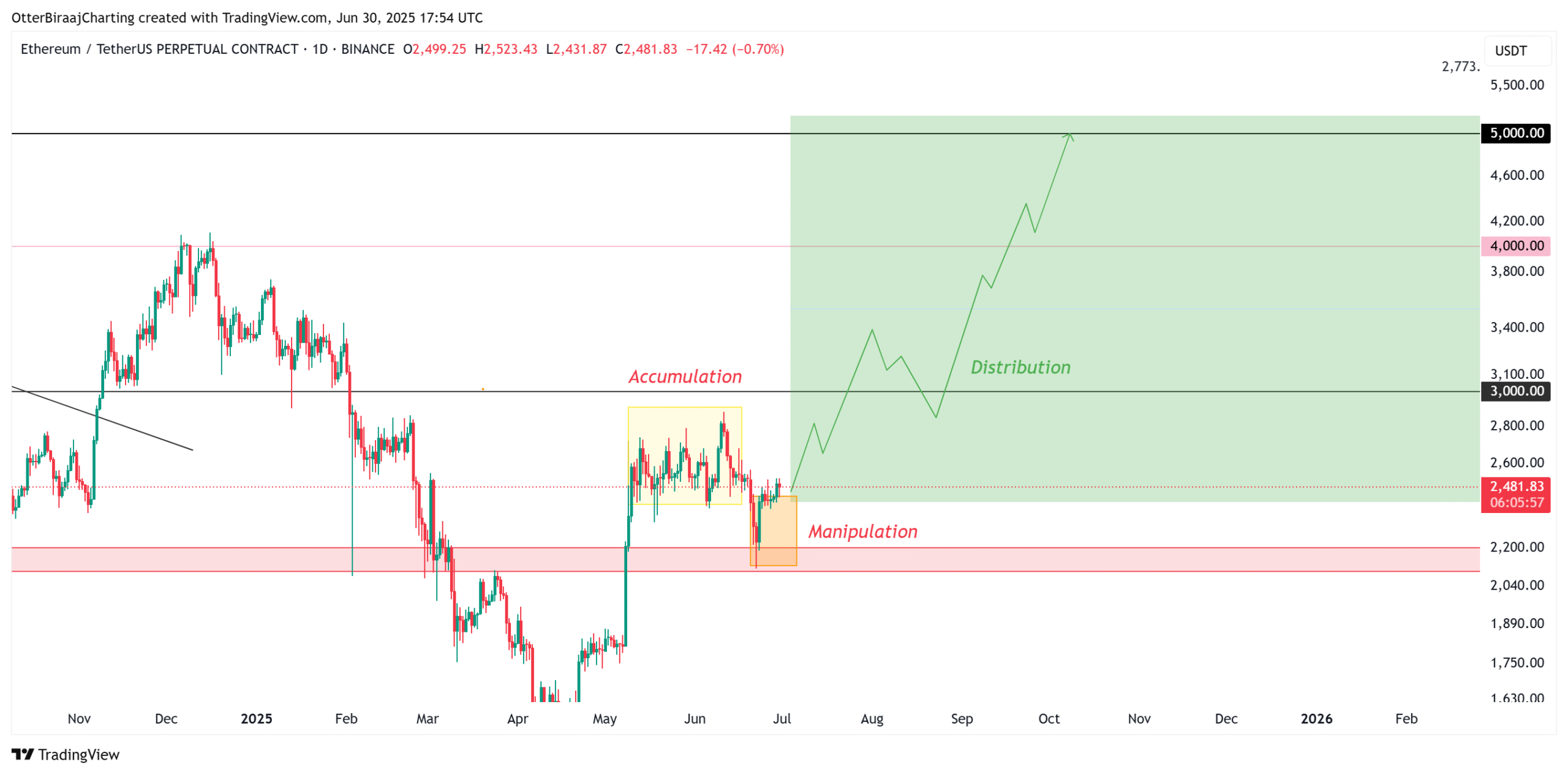 The distribution phase is now underway, where ETH begins moving aggressively in the opposite direction of the manipulation zone. Liquidity pools above become targets, and price often accelerates as trapped positions are unwound. In the current market, Ether distribution phase target lies above $5,000, i.e, a 100% rally.