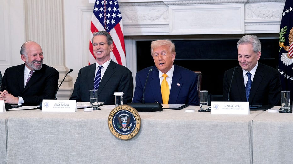 Commerce Secretary Howard Lutnick, Treasury Secretary Scott Bessent, President Donald Trump, and David Sacks, White House Artificial Intelligence (AI) and Crypto czar, during the White House Digital Assets Summit on March 7, 2025. (Chris Kleponis/CNP/Bloomberg via Getty Images / Getty Images)