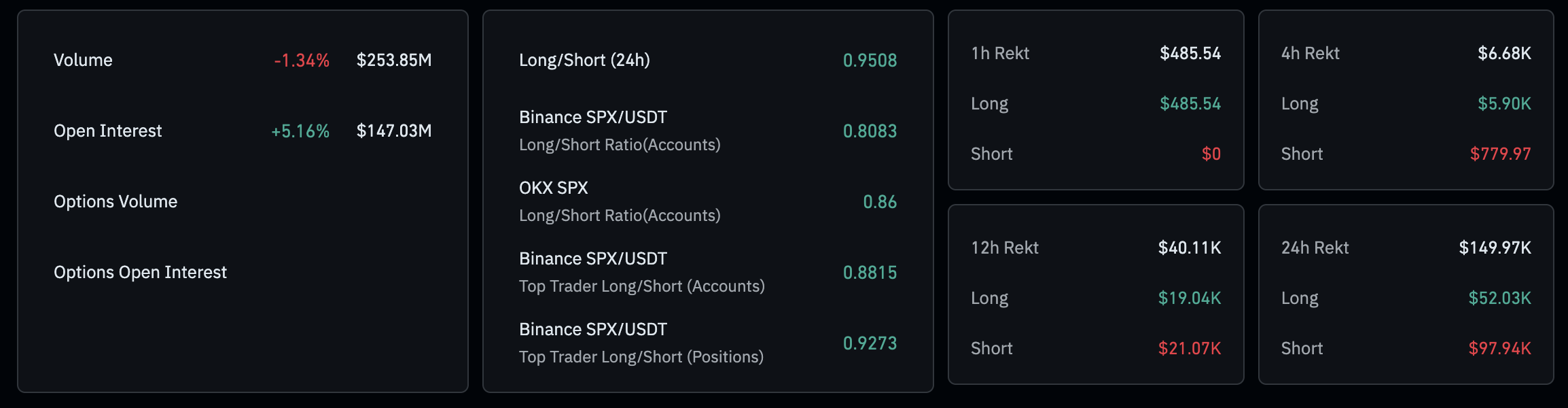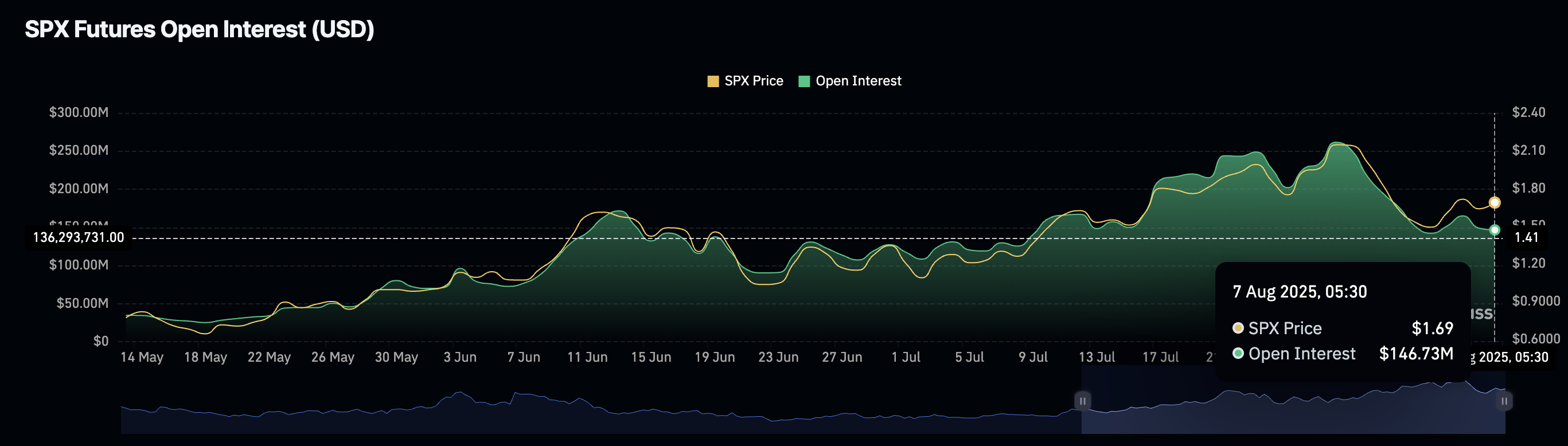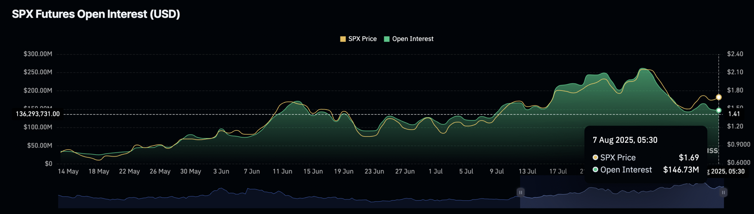 Coinglass data shows that the SPX OI stands at $146.73 million at press time, maintaining a stagnant trend after a decline last week, which aligned with the spot price’s downfall. As traders regain confidence, a slowdown in capital outflow from SPX futures and options contracts stabilizes OI.