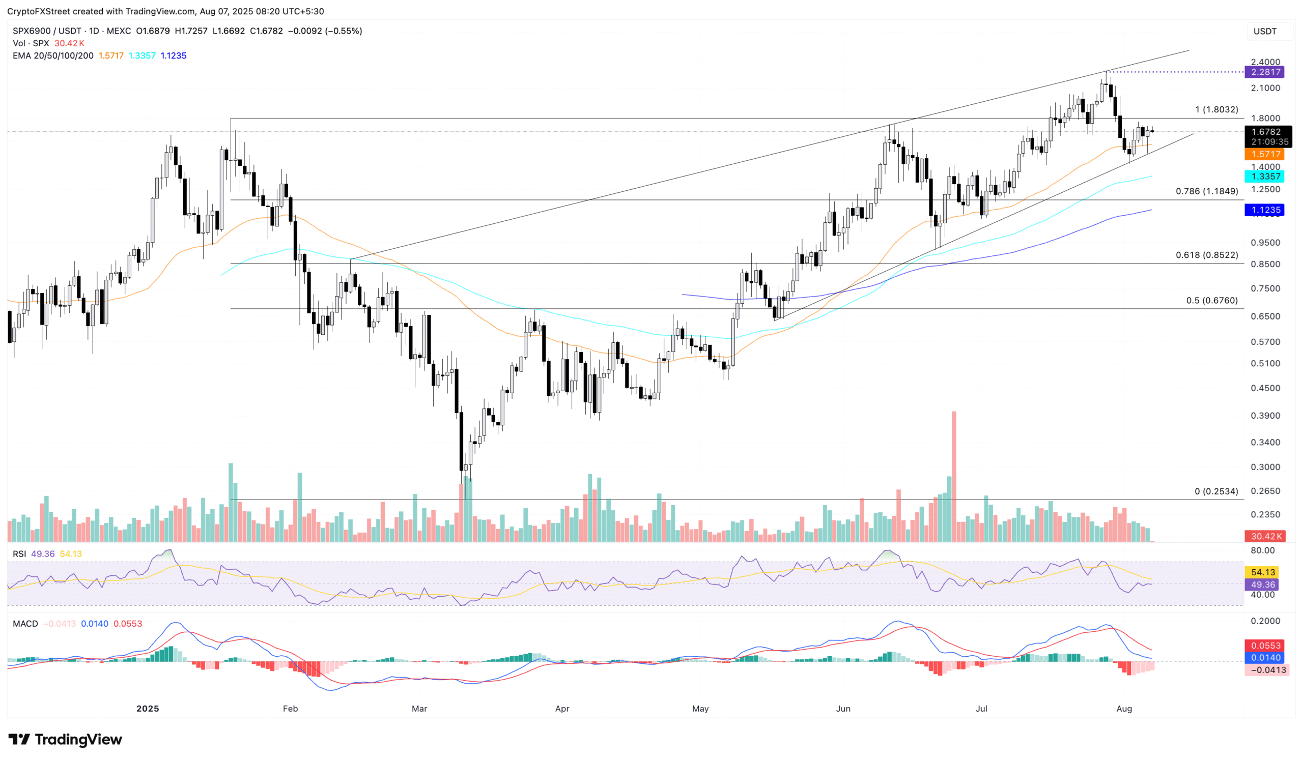 SPX meme coin holds above the 50-day Exponential Moving Average (EMA) at $1.5717 as it bounces off the support trendline of a rising wedge pattern on the daily chart. At the time of writing, SPX edges lower by 0.50% so far on Thursday following the nearly 3% gains from the previous day.