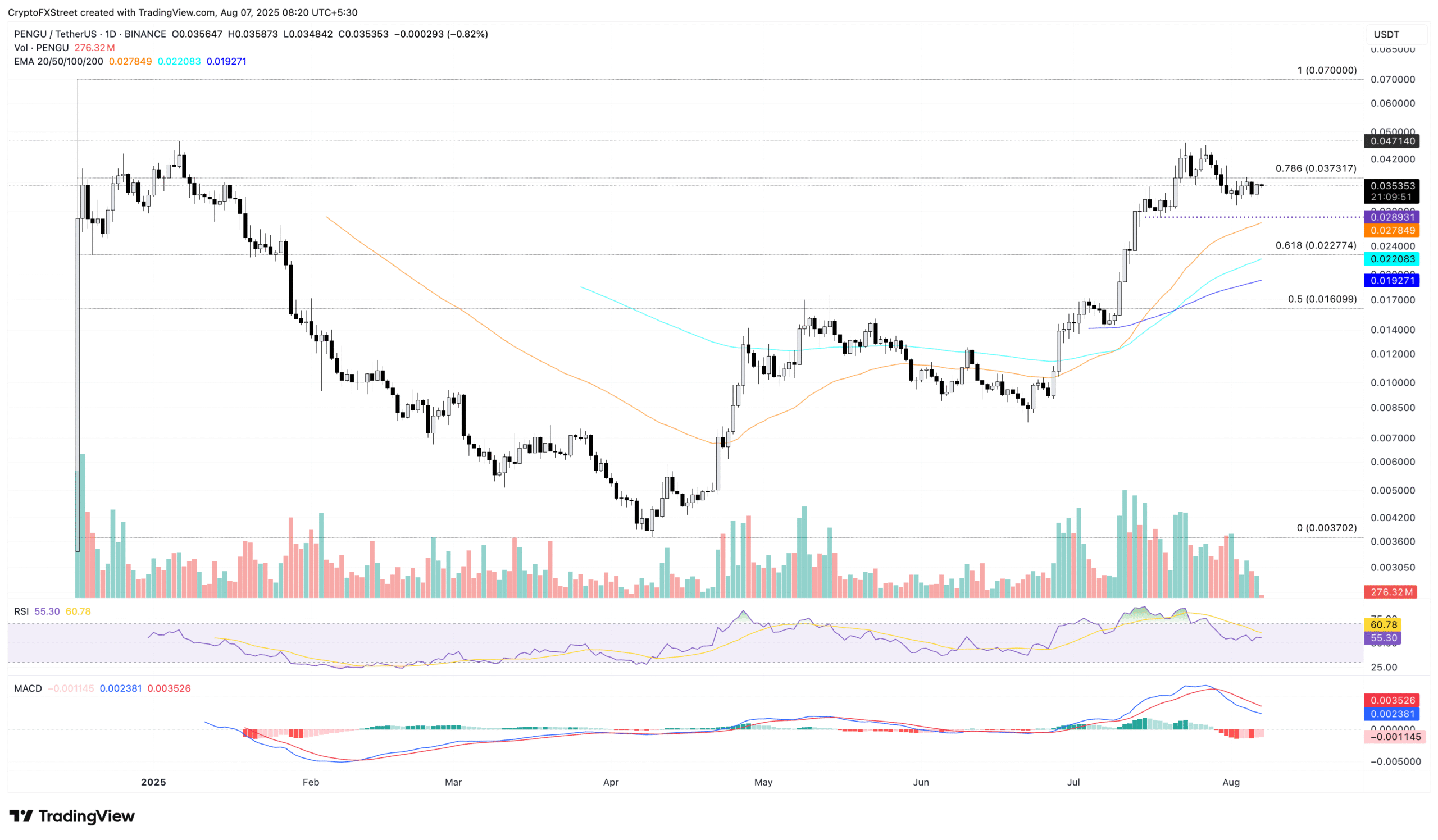 On the flip side, a reversal in PENGU from the $0.03717 resistance could retest the $0.02893 support level, marked by the July 15 low.