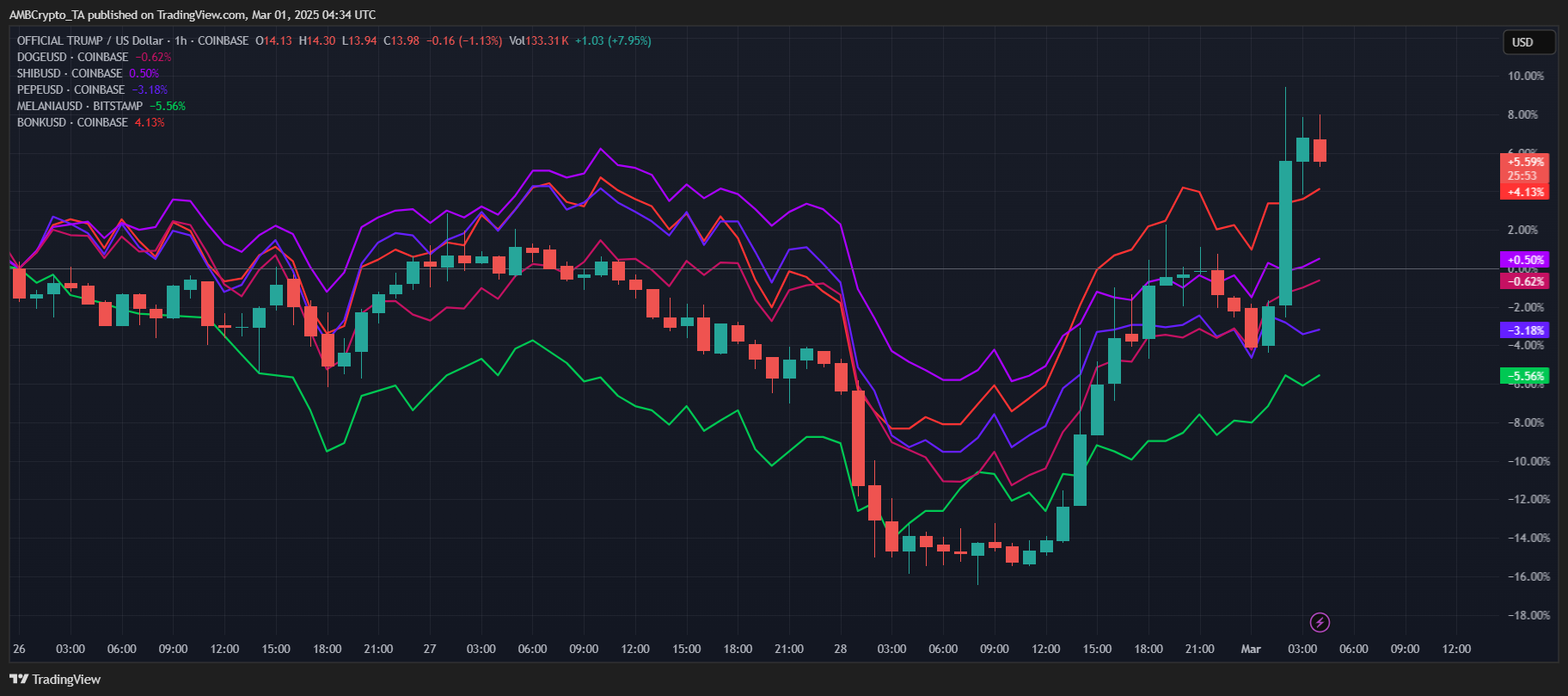 Hours after President Donald Trump’s fiery exchange with Ukrainian President Volodymyr Zelensky at the White House – an event some senators are already calling a “complete and utter disaster” – memecoins erupted in a frenzy of volatility. TRUMP skyrocketed, BONK rode a wave of momentum, while PEPE and MELANIA found themselves on the losing end of the trade.