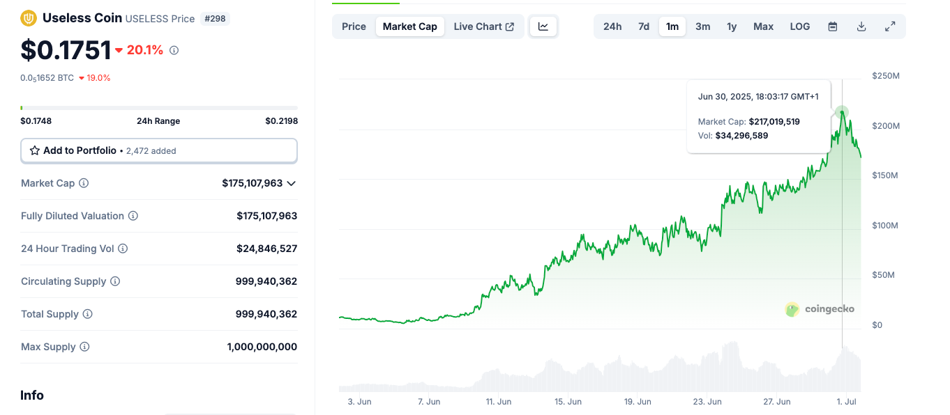USELESS token price action | Source: Coingecko, July 1, 2025